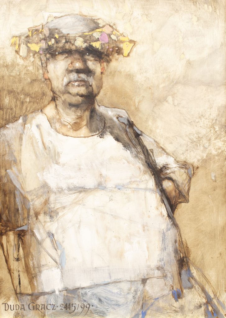 JERZY DUDA-GRACZ – urodził się w 1941 roku w Częstochowie, zmarł w 2004 roku w Łagowie. Był malarzem, rysownikiem, scenografem i pedagogiem. Absolwent Wydziału Grafiki na ASP w Katowicach. W latach 1976 – 82 był wykładowcą tej uczelni a następnie profesorem Uniwersytetu Śląskiego w Katowicach. Wykładał również w Europejskiej Akademii Sztuk w Warszawie (1992-2001). To co wyróżnia jego malarstwo to nie tylko znakomity warsztat ale także dbałość o szczegóły. Duda – Gracz w całym swoim dorobku artystycznym ponad 180 wystaw indywidualnych w kraju oraz za granicą (m.in. w Berlinie, Londynie, Paryżu, Moskwie, Rzymie, Wiedniu, Florencji, Düsseldorfie, Chicago, New Delhi, Monachium, Nowym Jorku i in.). Uczestniczył również w około 300 wystawach ogólnopolskich i międzynarodowych prezentacjach sztuki polskiej. Reprezentował Polskę m.in. na XLI Biennale Sztuki w Wenecji w 1984, na XX i XXI Światowych Targach Sztuki w Kolonii w 1986 i 1987 oraz na EXPO ’92 w Sewilli. Jego obrazy znajdują się w kolekcjach Muzeum Narodowego w Warszawie, Krakowie, Poznaniu, Wrocławiu i Gdańsku, w Muzeum Uniwersytetu Jagiellońskiego w Collegium Maius w Krakowie, Muzeum Ziemi PAN w Warszawie, w zbiorach sztuki na Jasnej Górze w Częstochowie i w innych muzeach okręgowych i miejskich oraz w kolekcjach prywatnych, m.in. W. Ochmana i W. Fibaka; za granicą – w zbiorach Uffizi we Florencji, w Muzeum im. Puszkina w Moskwie, Muzeum Miejskim w Gandawie, w Fundacji „BAWAG“ w Wiedniu i Kolekcji Watykańskiej oraz w galeriach i kolekcjach Austrii, Belgii, Czech, Danii, Francji, Holandii, Izraela, Japonii, Kanady, Meksyku, Norwegii, Rosji, Szwecji, Szwajcarii, USA, Wenezueli, Wielkiej Brytanii, we Włoszech i na Węgrzech.